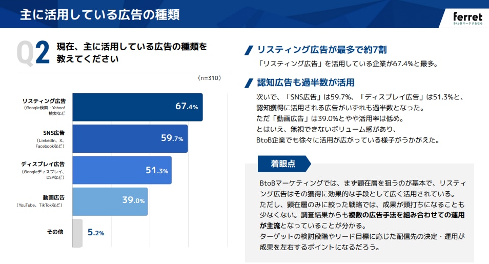 A. | 「リスティング広告(67.4%)」が最多。複数の媒体を併用するのが主流 |