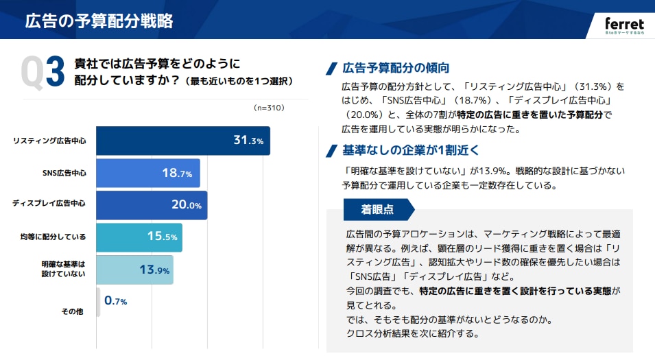 A. | 「リスティング広告中心(31.3%)」が最多。特定の媒体重視が全体の7割 |