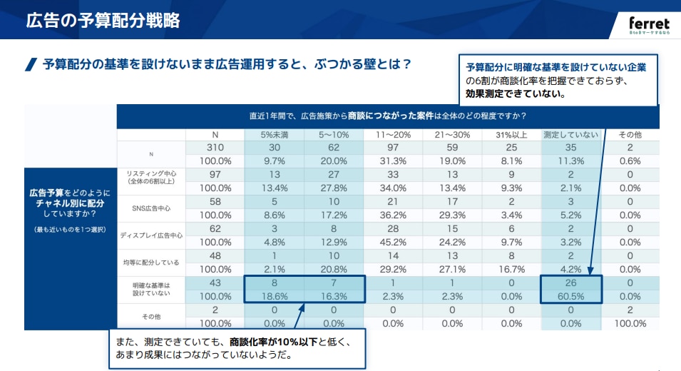データを見ると、「配分基準を設けていない」企業の51.2%が「ROIを測定していない」ことが分かります。 これは、「リスティング中心(未測定3.1%)」や「SNS中心(未測定3.4%)」など、意図を持って配分している企業と比較すると、圧倒的に高い未測定率です。