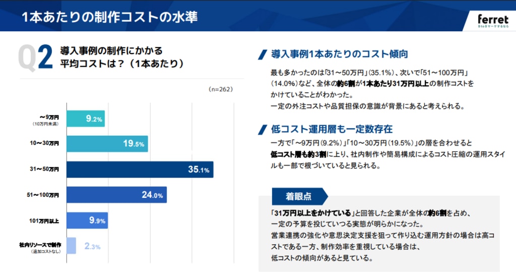 投資規模 | 1本30万円以上 | 「安く作る」ことよりも「質」へ投資する。ROIが「非常に高い」と評価する企業の67.4%が30万円以上をかけている |