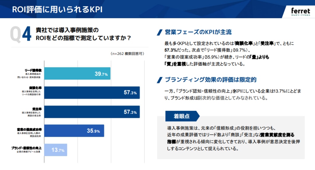 成果が出ない企業の多くは、「事例を作ってWebサイトに公開すること」がゴールになっています。 一方で、ROIが高い(成果を出している)企業は、「公開した事例を営業担当者が商談でどう使うか」という活用戦略を徹底しています。