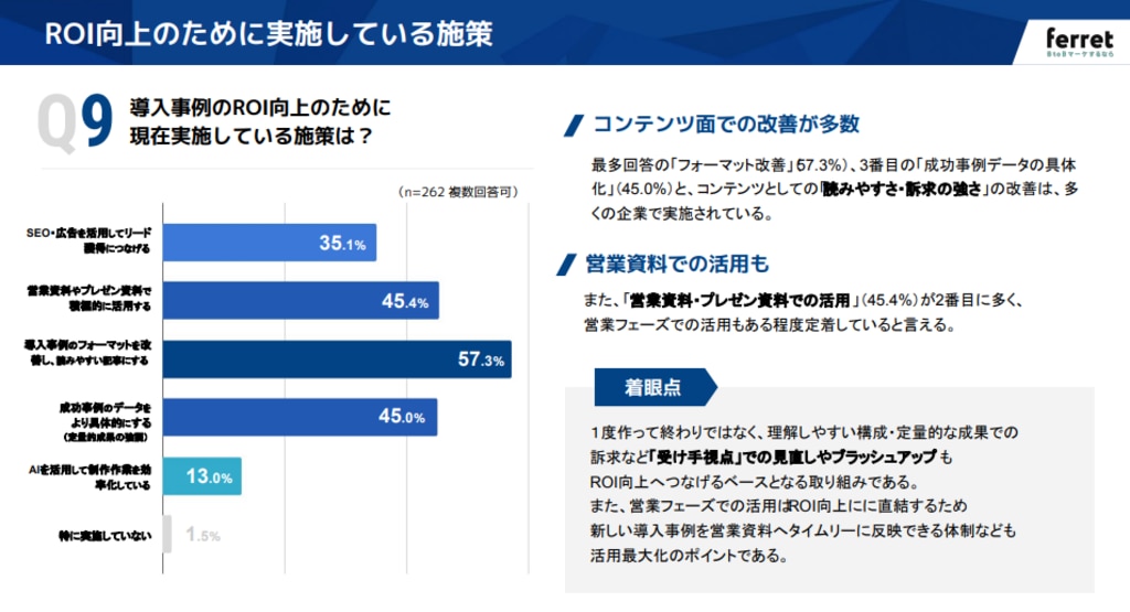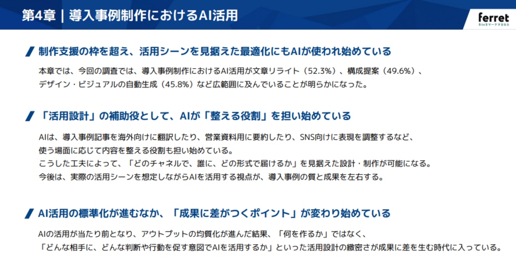 なぜ、同じように導入事例を作っても、成果が出る企業と出ない企業に分かれるのでしょうか? 調査レポートの総括では、その決定的な違いは「制作後の活用プロセスが設計できているか」にあると結論づけられています。