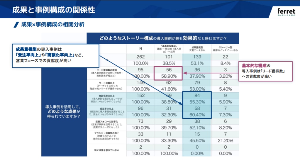 コンテンツ形式 | 成果重視型(数字訴求) | 決裁者の説得材料となる「導入効果の定量データ」を前面に出す。受注率向上を実感している企業の多くが採用している |
