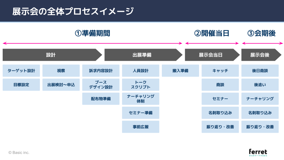 展示会の成功は、当日のブースの賑わいだけでは決まりません。むしろ、準備段階の戦略と会期後の熱量の維持にかかっています。商談化率を高めるための具体的なアクションを準備期間・開催当日・会期後の3つの期間に分けて解説します。