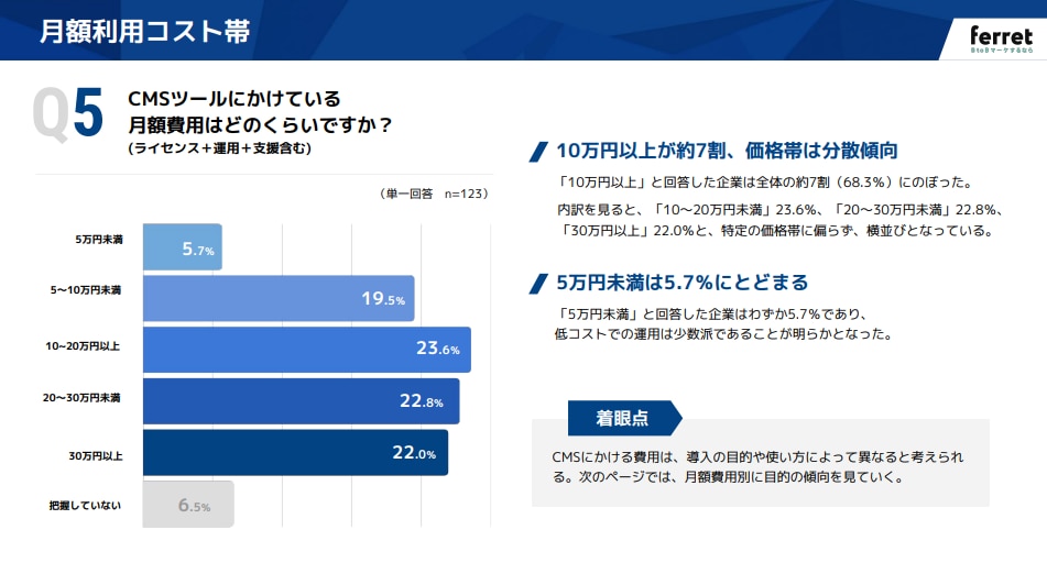 一方、「5万円未満」で運用している企業は5.7%にとどまりました 。BtoBマーケティングにおいて、CMSは単なる「安価なページ作成ツール」ではなく、一定の予算を投じて成果を求める「マーケティング基盤」として捉えられているといえます。