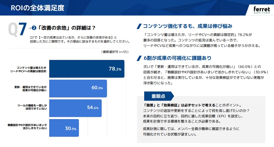 一方、「改善の余地がある」とした層では、コンテンツ量は増えたものの「リードやCVへの貢献が限定的(78.2%)」であったり、「成果の可視化が弱い(60.0%)」といった課題を抱えています。 施策は実行できているものの、「やりっぱなし」にならず正しく効果検証できるかどうかが、満足度をさらに引き上げるための壁となっているようです。