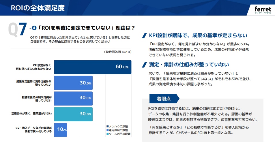 「ROIを測定できていない」層では、「KPI設定がなく何を見ればよいか分からない(60.0%)」が最多でした 。 導入段階で「何を成果とするか」を決めずにスタートしてしまうと、後から評価しようがなくなり、改善の打ち手も見えなくなってしまいます。CMS導入においては、ツール選定と同じくらい「目標設計」と「運用体制づくり」が重要であることを示唆しています。