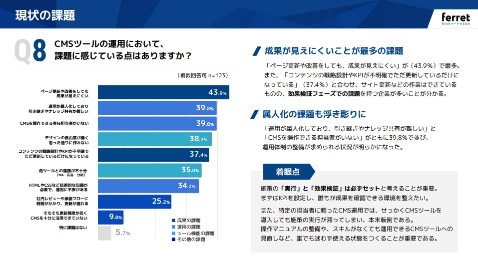 また、「運用が属人化しており引き継ぎが難しい(39.8%)」や「CMSを操作できる専任担当者がいない(39.8%)」といった体制面の課題も上位に並び、特定の担当者に依存した不安定な運用状況もうかがえます。