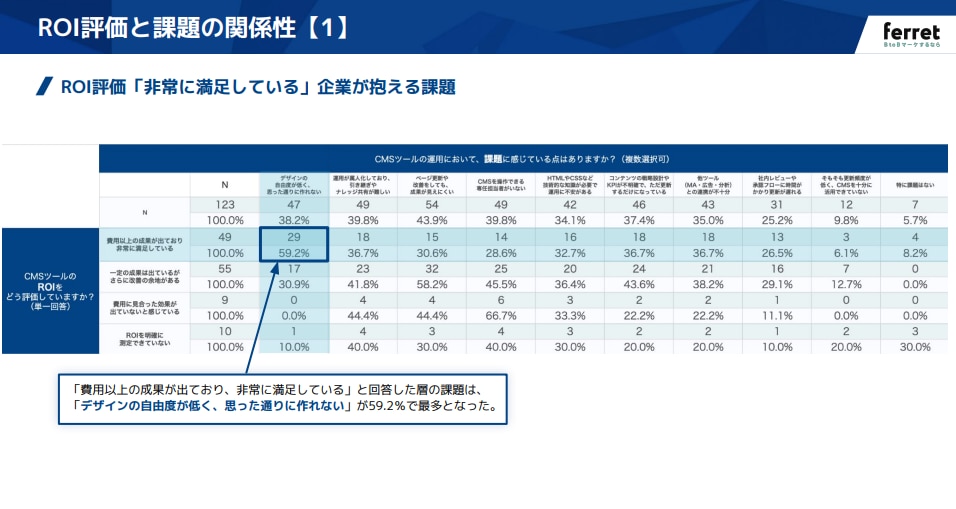 「費用以上の成果が出ており非常に満足」と回答した層では、「デザインの自由度が低く、思った通りに作れない(59.2%)」が課題のトップでした。