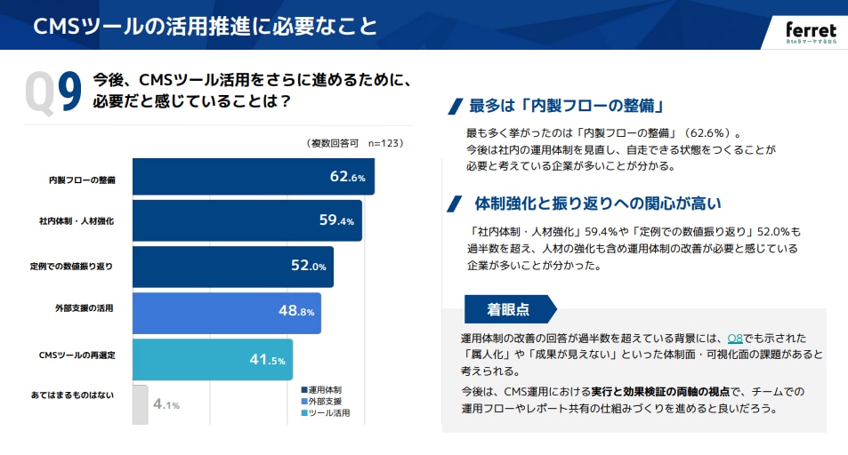 本章の調査データから明らかになった、CMS運用の課題解決と、今後の活用強化に向けた重要なポイントをまとめます。