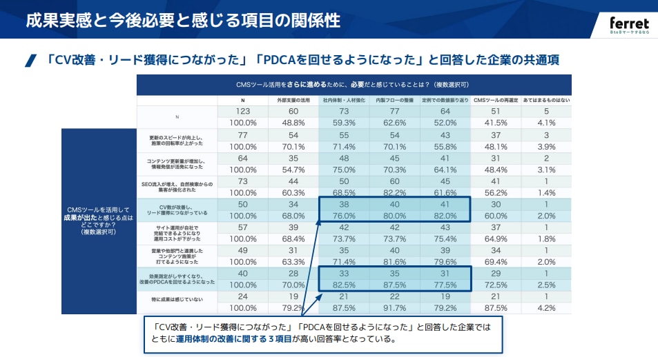 分析の結果、「CV改善・リード獲得につながった」あるいは「PDCAを回せるようになった」と回答した企業では、以下の3項目に対する回答率が非常に高い傾向にありました。