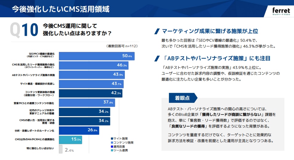 今後強化したい領域としては、「SEO・CV導線の最適化」や「リード獲得施策」が上位を占めました。単にページを更新する段階を卒業し、ABテストやパーソナライズ施策を通じて「より良質なリード」を獲得するためのマーケティング活用へとフェーズが移行しています。