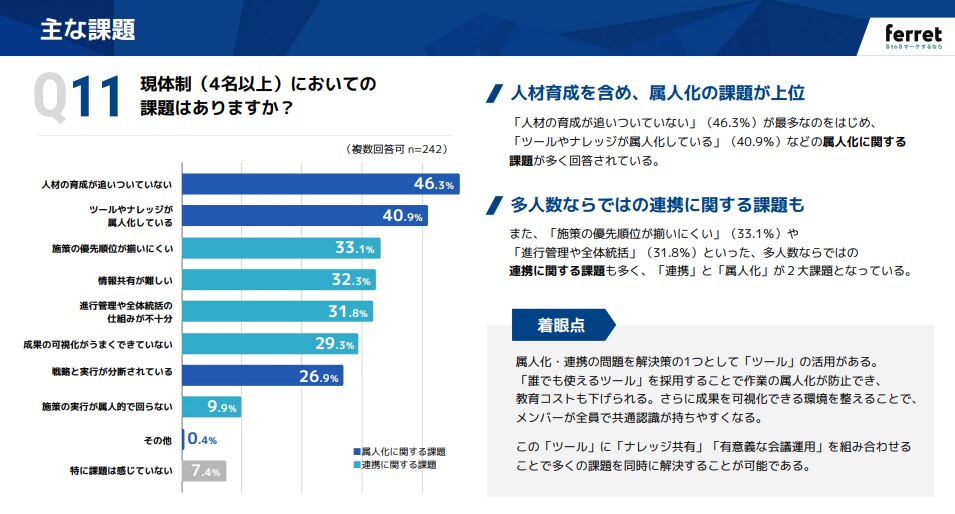 4名以上の組織では、実行リソースはある程度確保できていますが、その分「人材育成」や「属人化」といった組織課題が深刻化しています。人が増えれば解決するわけではなく、教育コストやナレッジ共有の仕組み作りが急務となっています。