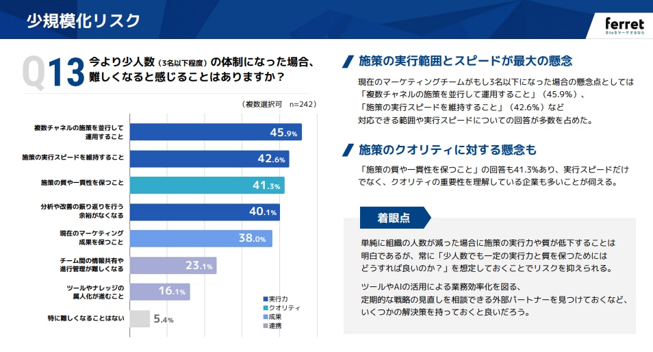 4名以上の組織では「施策を並行して進められる(53.3%)」ことが最大の強みです。一方で、もし3名以下になった場合は「複数チャネルの施策を並行して運用すること(45.9%)」が最も困難になると予測されており、リソース減が実行スピードに直結するリスクを抱えています。