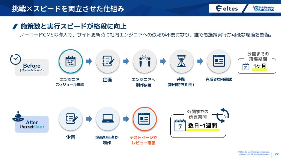 - ノーコードCMSによる脱属人化エンジニアへの依頼フローを撤廃。自部署で修正が可能になり、施策実行までのリードタイムが「1ヶ月」から「数日〜1週間」に短縮。