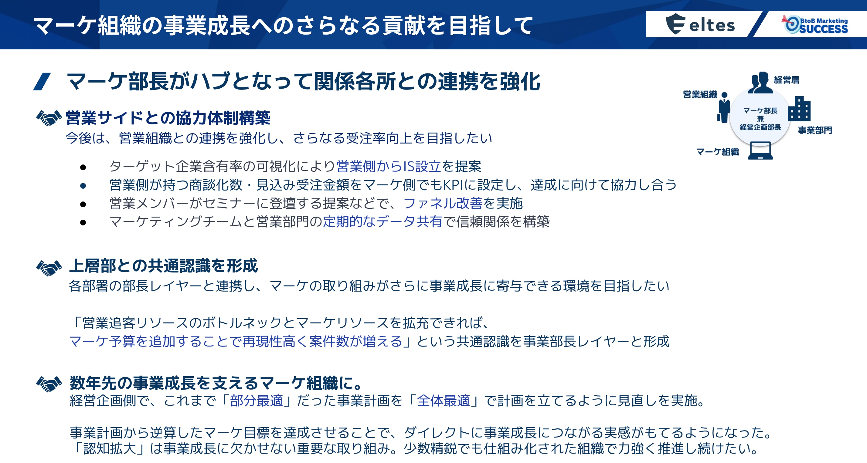 はい。ですので、事業部長クラスや幹部と「今はこういう意図で、ここに投資をしているんだ」という認識を揃えることが重要です。マーケティングが単なる一部署の活動ではなく、全社の成長エンジンとして機能するよう、全体最適の視点で推進していきたいですね。