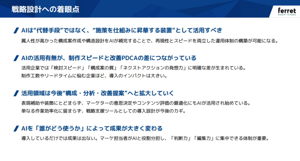 AIを活用して構成案のたたき台を作ったり、外部パートナーに実制作を依頼したりすることで、担当者は「誰に・何を届けるか」という戦略設計に集中できるようになります。
