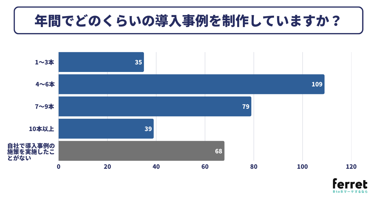 全体の60%以上の企業が、年間4本以上の事例を制作しており、一定の工数をかけて継続的に取り組んでいる企業が多いことがわかります。