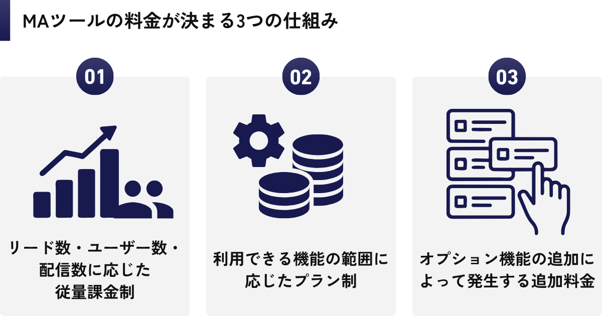その中でも代表的なのが、「リード数・ユーザー数・配信数」「利用できる機能の範囲」「オプションの有無」の3つです。 これらの料金体系を理解することで、なぜツールによって金額が異なるのか、また自社にとってどのプランが最適なのかを判断しやすくなります。
