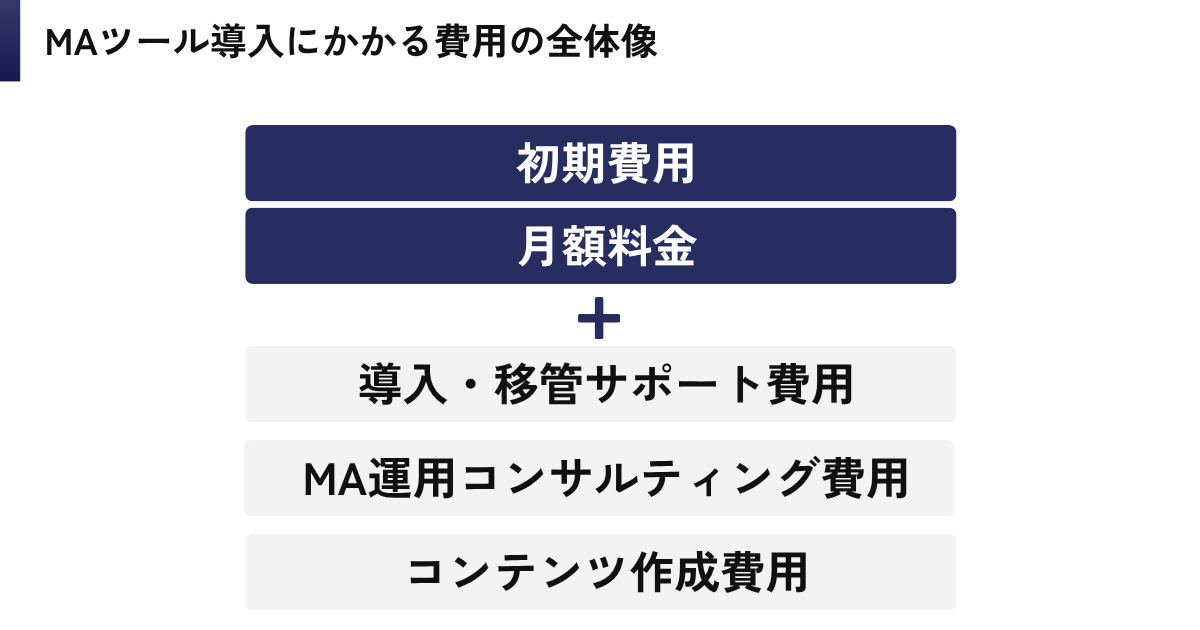 大きく分けると、初期設定時に必要な「導入費用」と、継続的に発生する「月額料金」が基本となります。 さらには、これらに加えて、導入時のサポートや運用コンサルティング、さらにはMAツールで配信するコンテンツの作成にも別途コストが発生する場合があります。