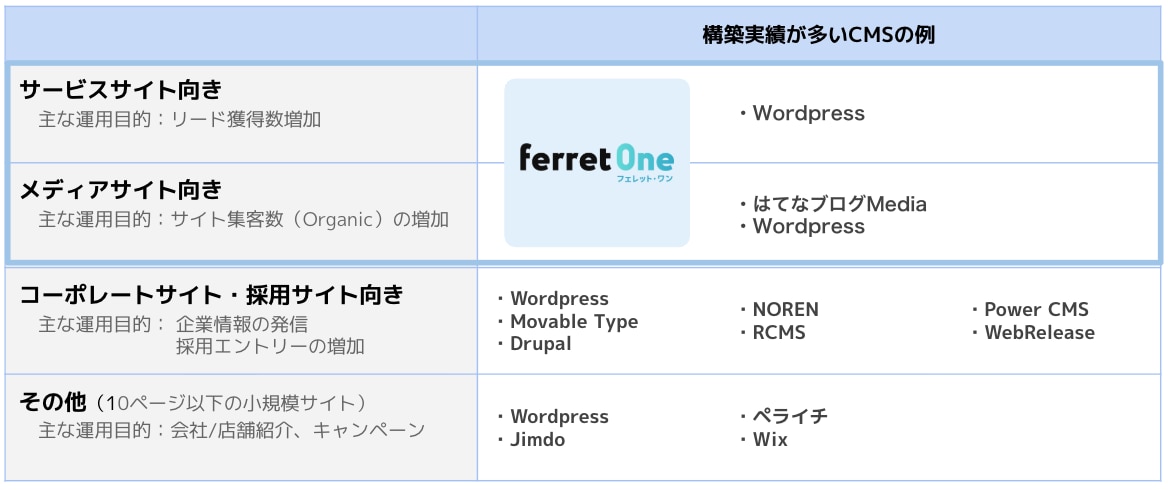 ferret One | Word press | Movable Type | ペライチ | Drupal | Web Release | Power CMS | RCMS | NOREN | Jimdo | Wix | BiNDup | ||