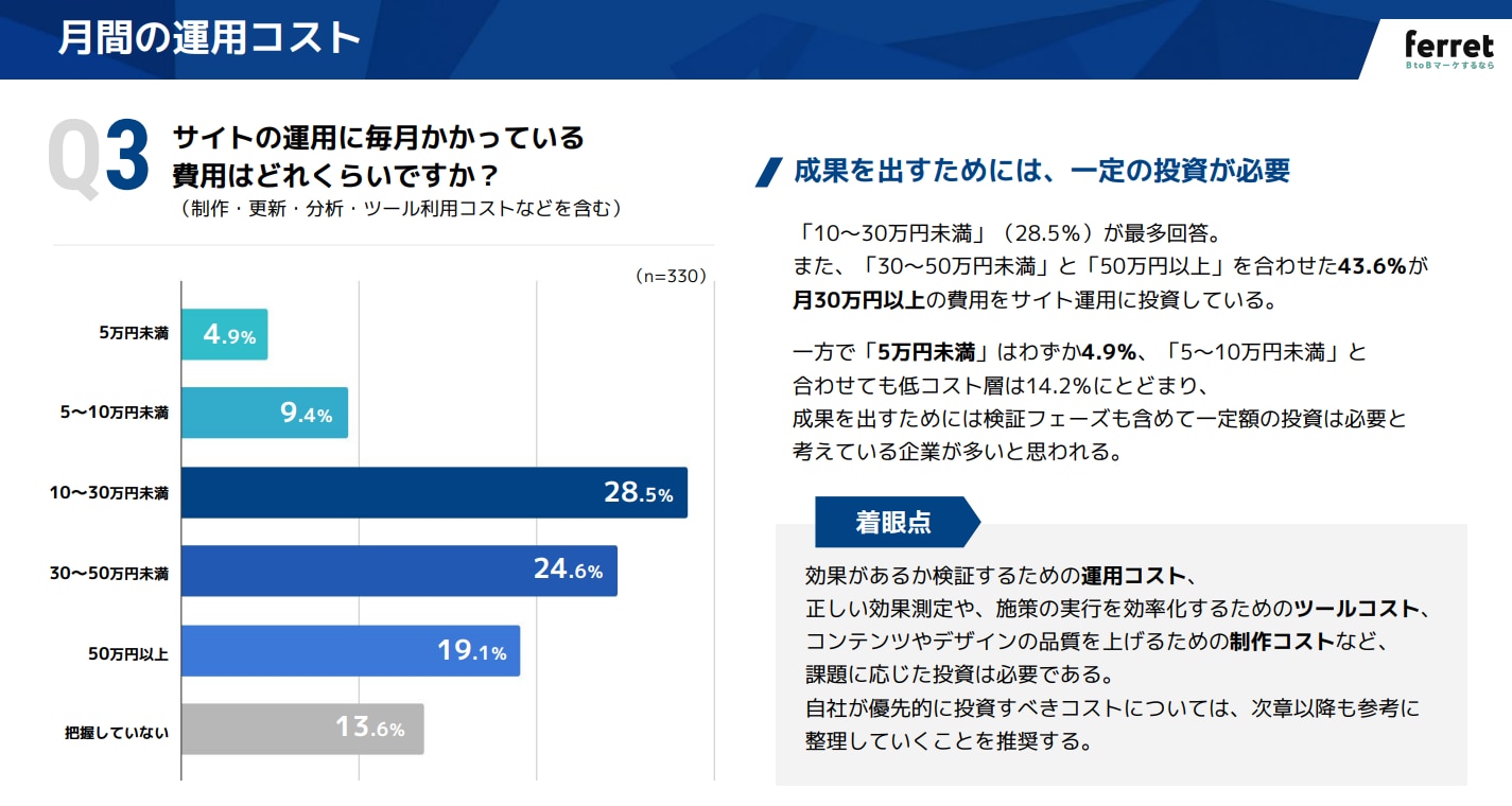 「なるべくお金をかけずに」と考えがちですが、実態は異なります。約7割の企業が月10万円以上の運用コストをかけており 、成果を出している企業ほど、適切な投資を行っています。特に分析ツールや質の高いコンテンツ制作への投資は、運用を成功させるための必要経費と捉えられています。