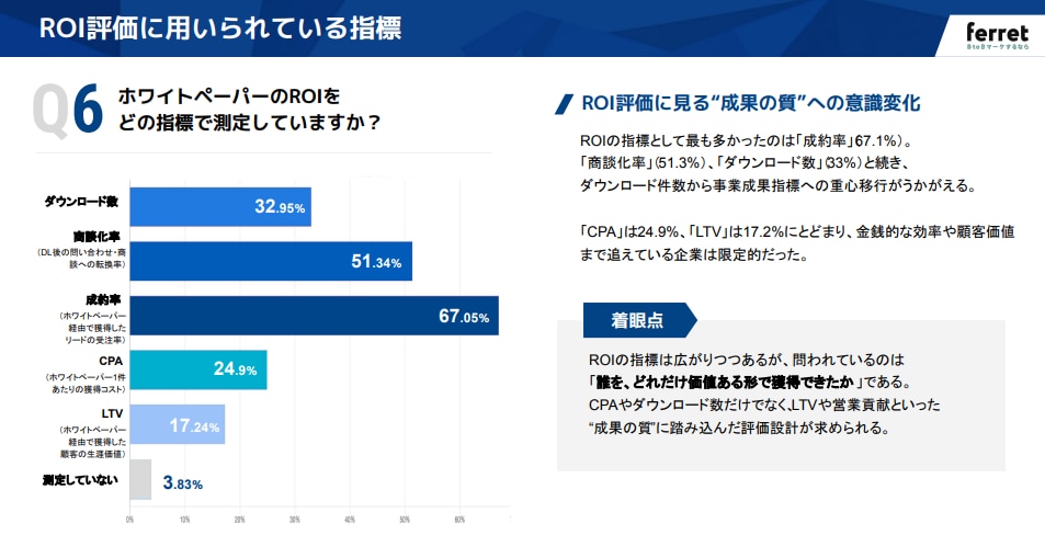 続いて、各社がホワイトペーパー施策の費用対効果(ROI)を「どの指標」で測り、「どう評価しているか」を見ていきます。ここには、BtoBマーケティングのトレンド変化が色濃く表れています。