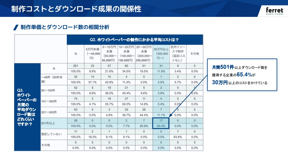 データを分析すると、月間500件以上のDLを獲得している企業の約8割が「年間10本以上」制作し、約6.5割が「1本30万円以上」のコストをかけていることが判明しました。成果を出すためには、ある程度の「量」と「投資」の両立が近道と言えます。