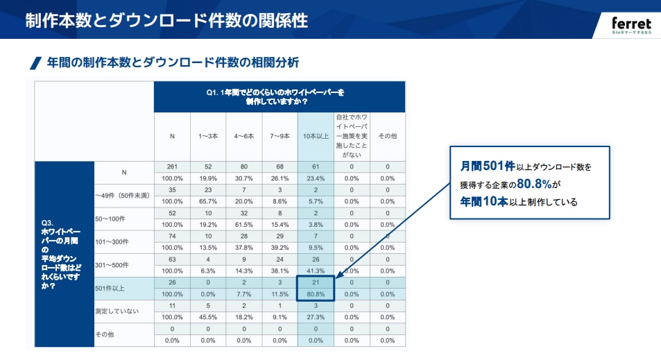 月間「501件以上」を獲得している企業の80.8%が、年間「10本以上」制作しているのです。 逆に、年間制作数が「1~3本」にとどまる企業の65.7%は、月間ダウンロード数が「50件未満」に留まっています。