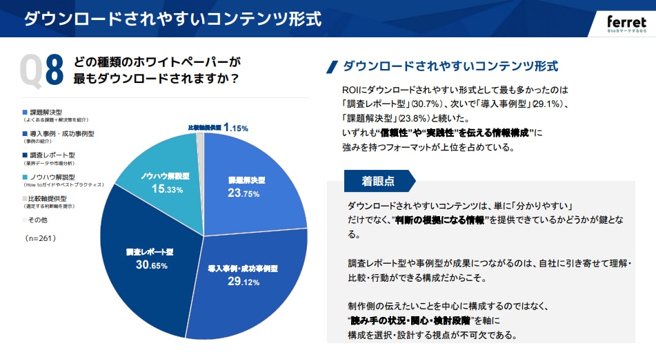 最もダウンロードされやすい形式として選ばれたのは、「調査レポート型(30.7%)」と「導入事例・成功事例型(29.1%)」でした。