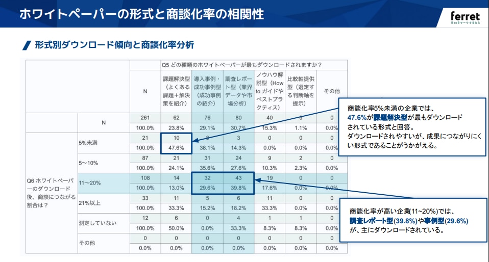 調査から明らかになった、ホワイトペーパーの「コンテンツ形式」と「成果(商談化率)」の関係性について重要なポイントをまとめます。
