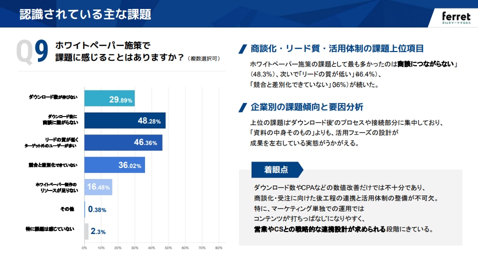 調査から明らかになった、ホワイトペーパー施策の「運用課題」と「改善アクション」に関する重要なポイントをまとめます。