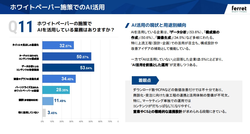 ホワイトペーパー施策において「AIを活用していない」企業はわずか3.5%にとどまりました。活用業務のトップは「データ分析(53.6%)」や「構成案作成(50.6%)」であり、AIは単なる文章作成ツールではなく、企画や分析への活用も定着しつつあります。