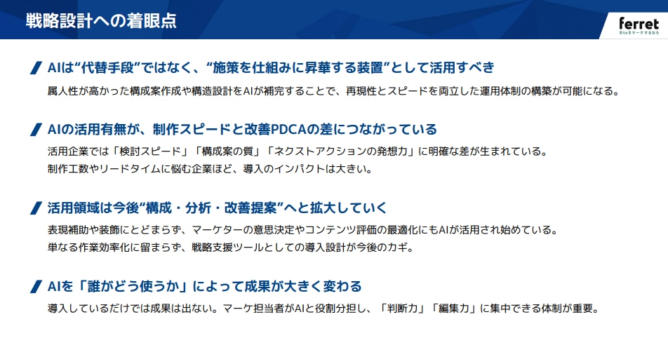 レポートの分析によると、成果を出している企業は、これまで属人性が高かった「構成案の作成」や「構造設計」といったプロセスをAIに補完させることで、「誰がやっても一定の品質とスピードが出せる状態」を構築しています。単に楽をするためではなく、再現性のある運用体制を作るためにAIを活用している点が大きな特徴です。