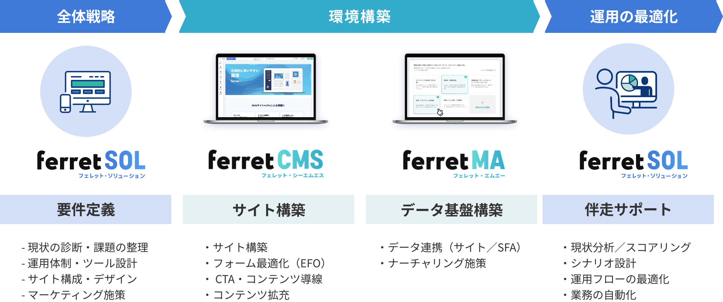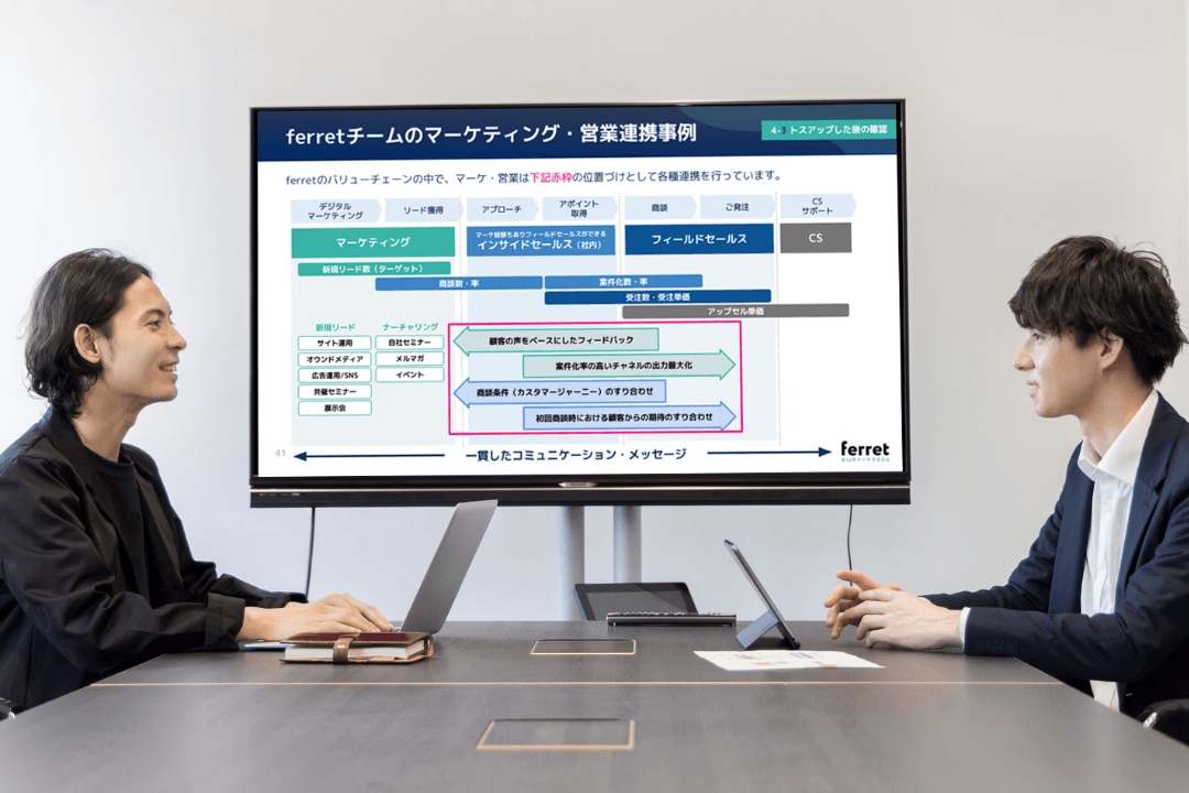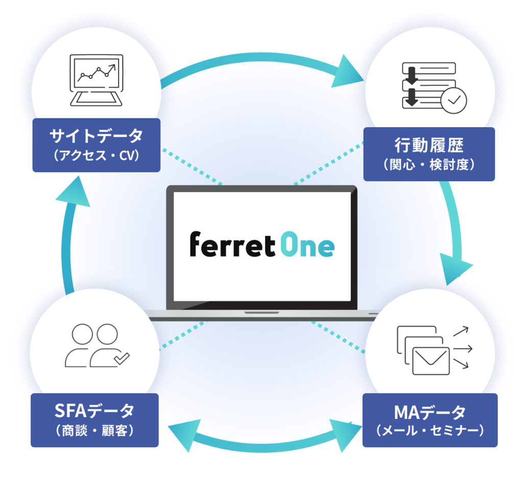 ferret Oneでは貴社のマーケティング状況や導入ツールをヒアリングし、分断のボトルネックを特定。運用体制・ツールの活用方法・やるべき施策までの全体最適化の視点で、まずは成果を最大化するための全体像を設計します。