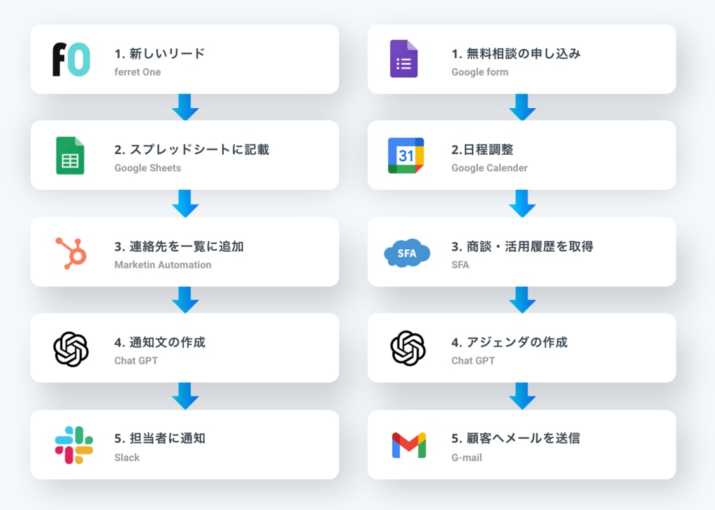 フォーム送信、商談発生、ファイル登録、Slack投稿などを起点に、必要なデータがSFA・CRM・MA・チャット・スプレッドシートへ自動で連携される仕組みを構築します。