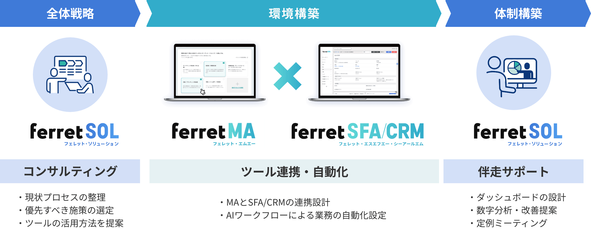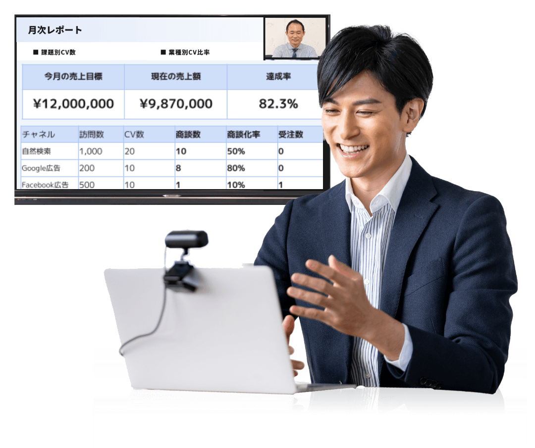 どのチャネルのリードが商談になったか。どのナーチャリング施策が効いたか。必要なダッシュボードの設計、数字分析や改善提案、定例ミーティングなど伴走型で支援します。