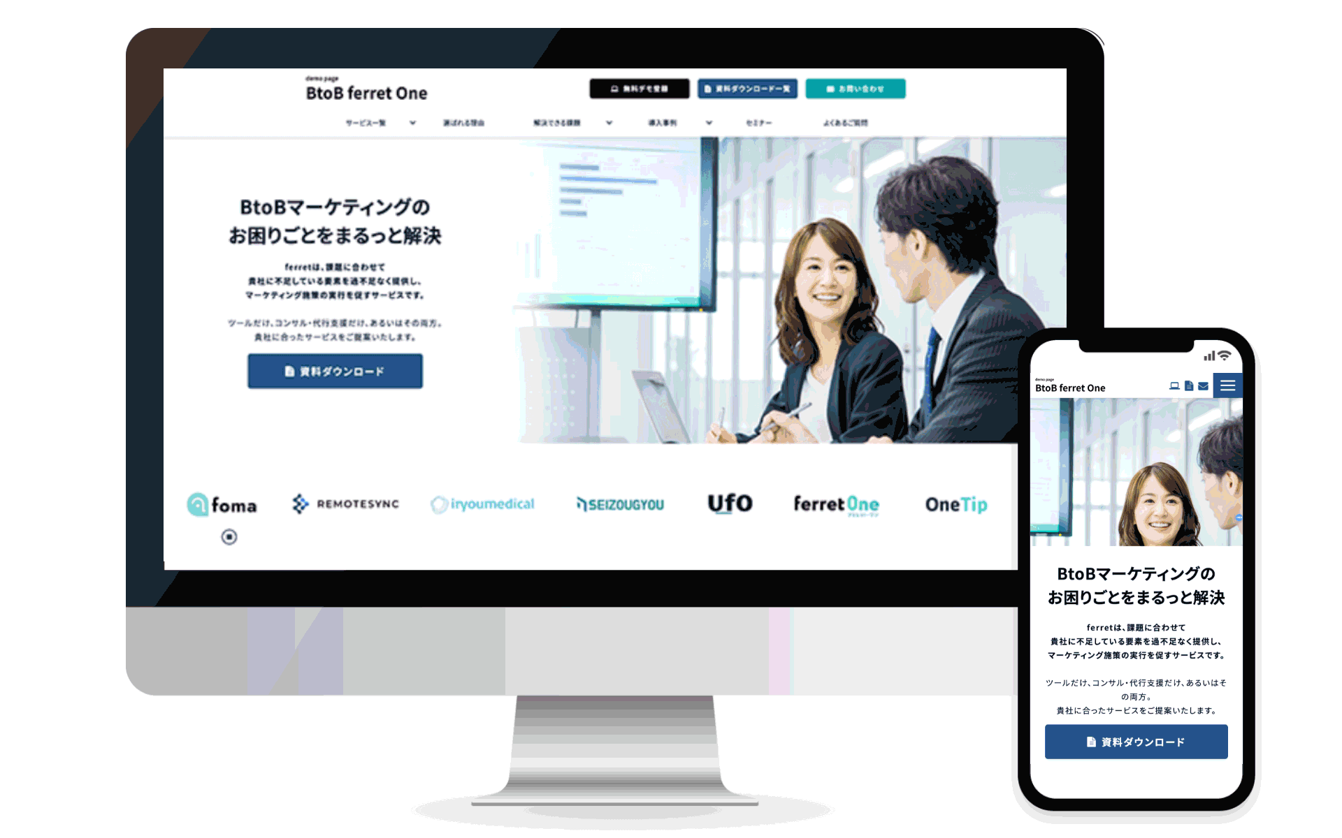的確な要件定義、あらゆる事業課題に応える豊富なフレームワーク、BtoBの心理に基づいたライティングまで一貫してご支援。納品後の効果検証・更新がしやすいサイト運用ツール【ferret One】で構築することで、成果が見える・施策の打ちやすいサイト運用環境が実現します。