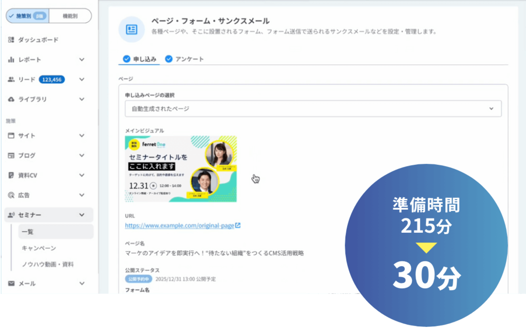セミナーは、LP作成・メール作成・ポップアップ・キャンペーン管理など、複数の画面を行き来する必要があり、抜け漏れや作業ストレスが発生しがちです。セミナー機能は、それらを1つの画面に集約しているため、ferret One未経験者でも迷わず、準備にかかる時間を短縮できます。