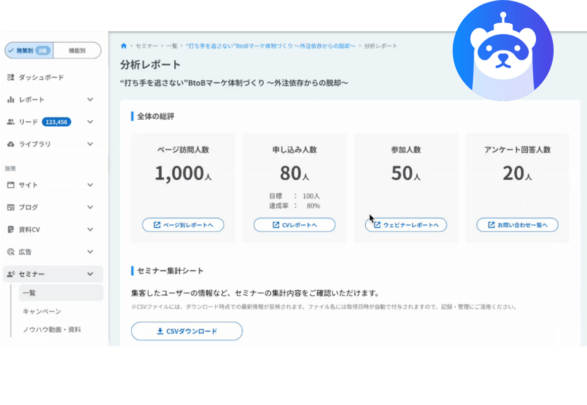 セミナーの振り返りで必要な情報を一覧で表示。申し込みデータと出欠、アンケート結果を統合したCSVファイルもダウンロードできるため、面倒なデータの集計・突合作業がなくなります。