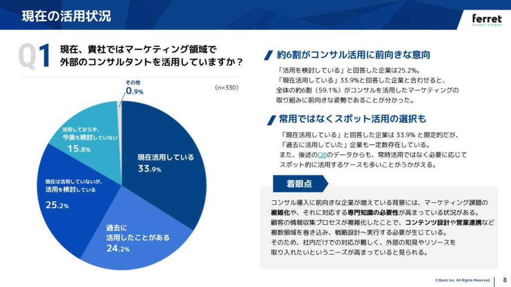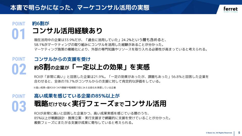 本書は、2025年に実施した最新の独自調査(n=330)をもとに、コンサル活用の現状と成果実感、さらに高ROI企業に共通する傾向について明らかにしました。